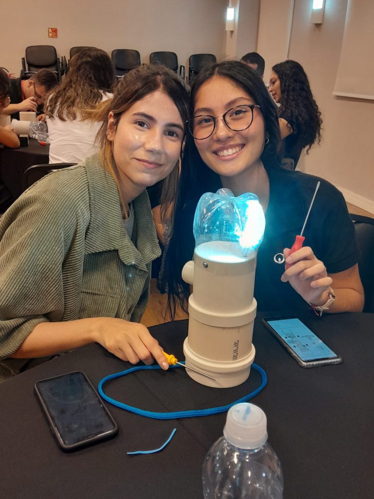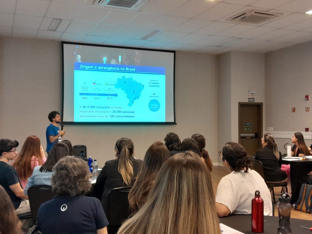 Essa parceria ajuda a ilustrar como esse trabalho toma forma. Em 2024 e no início de 2025, três ações pontuais marcaram essa aproximação: uma oficina do Litro de Luz para montagem de lampiões solares e duas atividades no Ateliê Escola do Instituto Acaia, a primeira ação fora dedicada à limpeza do espaço e à instalação de uma horta em cochos; e a segunda, voltada à construção de casinhas de papelão.